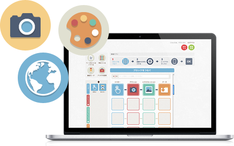 プログラム言語の知識は必要なし、Webブラウザ上で様々な機能を持ったブロックをパズルのように組み合わせたり、画像などを変えるだけで、自由に・自分だけのオリジナルアプリをつくることが出来ます。