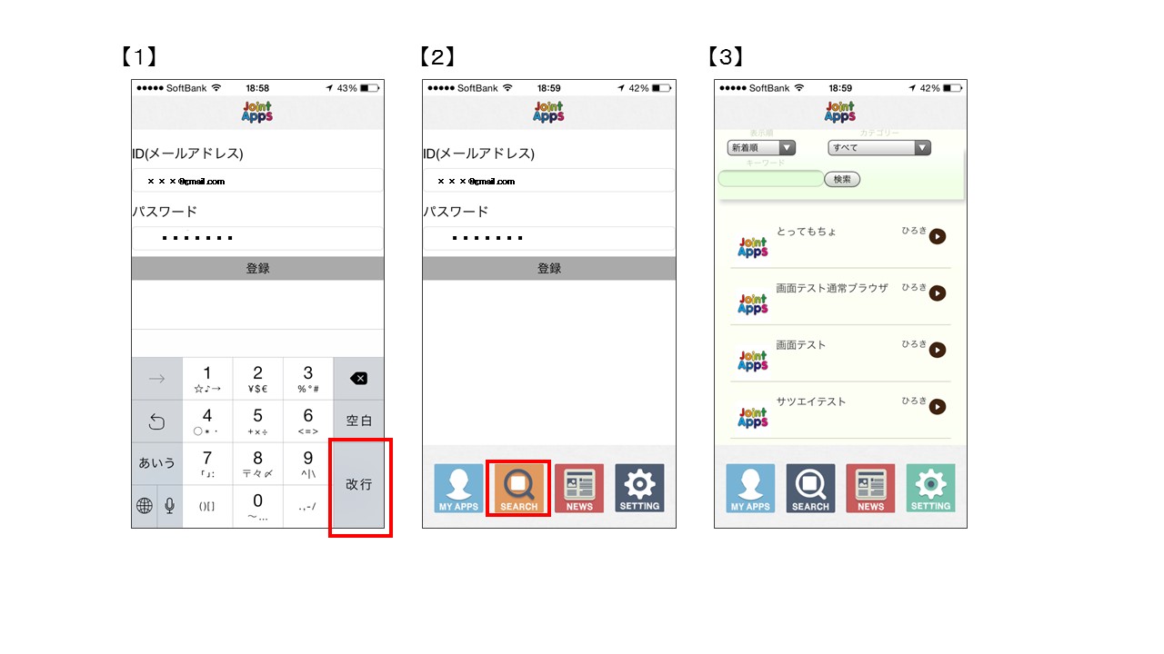 【1】のキーボードの右下 『改行』をタップしてください。