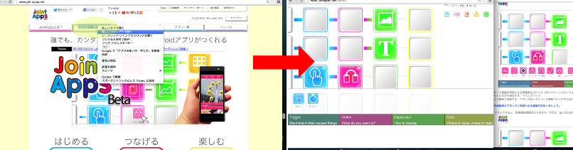 JointAppsは、ブロックをつないでアプリを作れる”ブロックエディタ”が搭載されたポータルサイトと、作ったアプリデータを再生する”JointAppsPlayer”というAndroidアプリの2つで構成されています。